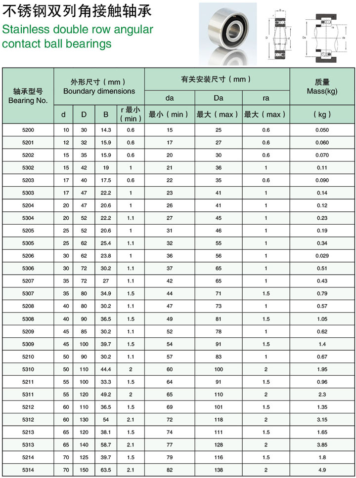 不锈钢双列角接触球黄瓜网站视频型号尺寸规格参数